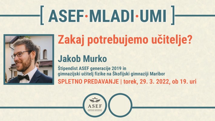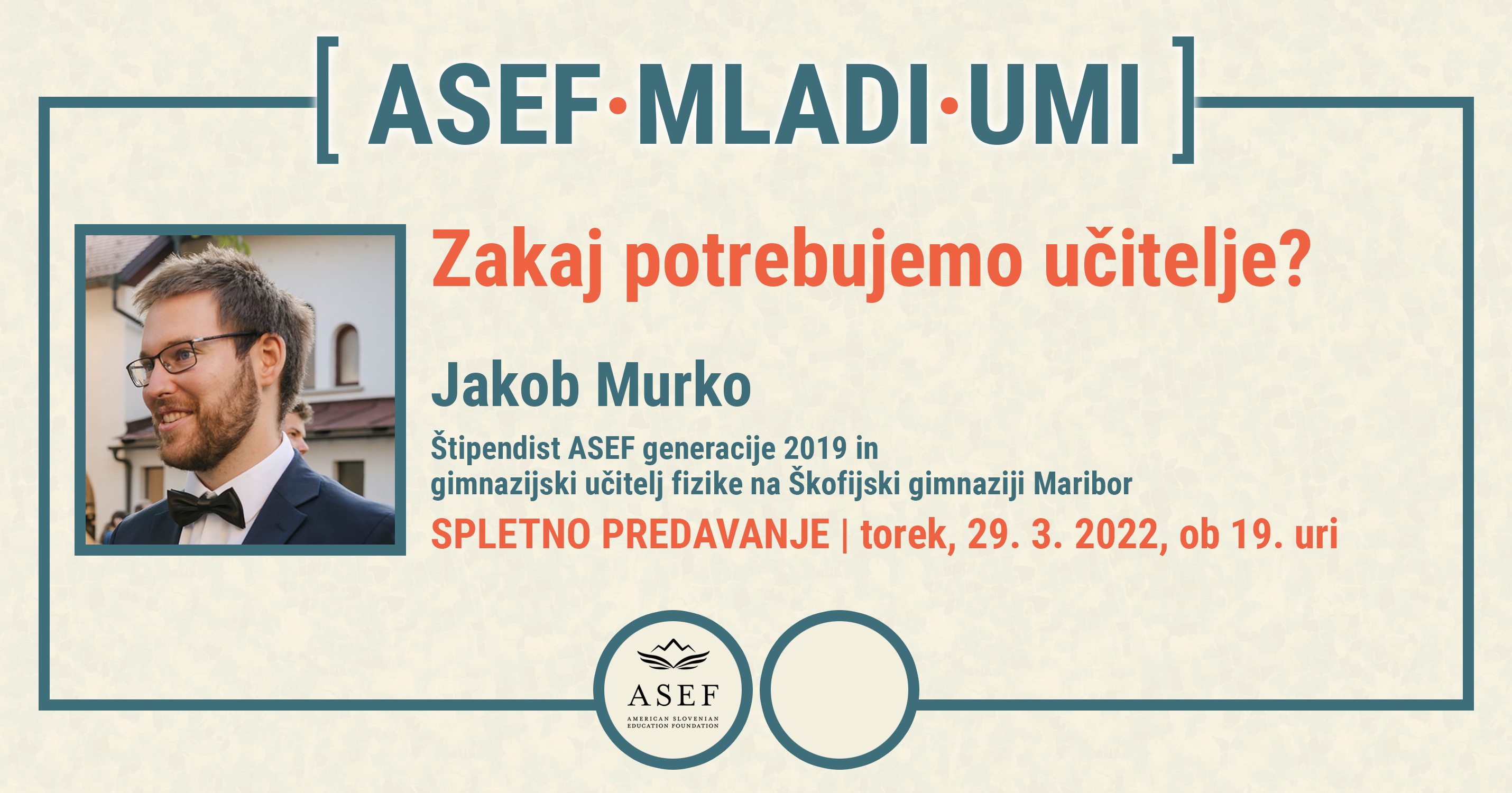 Ameriško-slovenska izobraževalna fundacija (ASEF) organizira spletno poljudnoznanstveno predavanje z naslovom "Zakaj potrebujemo učitelje?", ki ga bo v torek, 29. marca, ob 19. uri izvedel Jakob Murko, štipendist ASEF generacije 2019 in učitelj fizike na Škofijski gimnaziji Maribor.