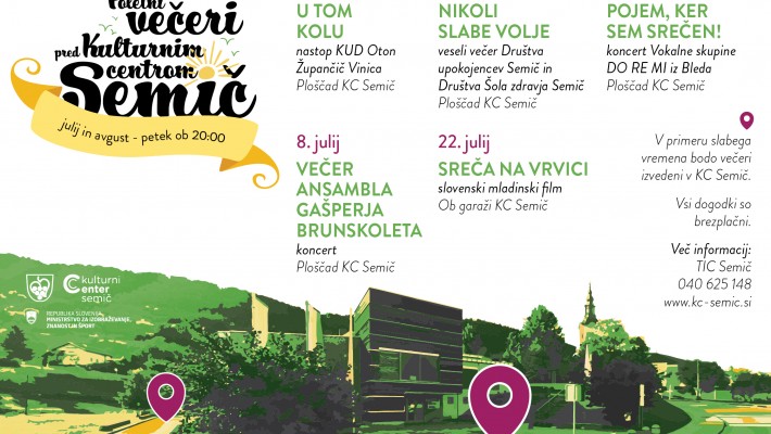 Kulturni center Semič vas vabi na sklop dogodkov POLETNI VEČERI PRED KULTURNIM CENTROM SEMIČ, ki se bodo odvili ob petkih v mesecu juliju in avgustu 2022.