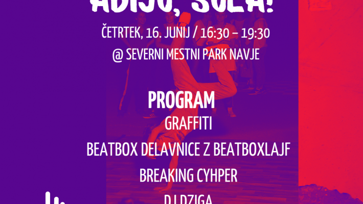 ULCA vas vabi na tradicionalni dogodek ob koncu šolskega leta Adijo, šola!, ki bo potekal v četrtek, 16. junija med 16.30 in 19.30 v Severnem mestnem parku (Navje) v okviru NEXTivala - festival mla