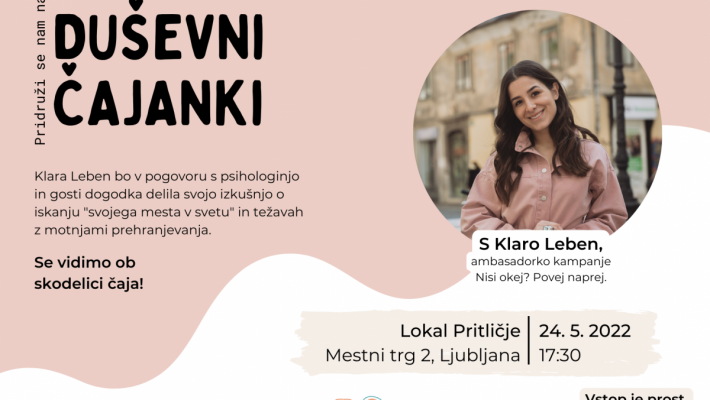 vabljeni na na prvo duševno čajanko v sklopu nacionalne kampanje proti stigmatizaciji duševnega zdravja Nisi okej? Povej naprej.