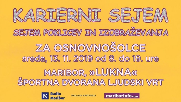 V sredo, 13. novembra 2019 od 8. do 19. ure bo v Športni dvorani Ljudski vrt »Lukna«, Mladinska ul. 26 v Mariboru potekal Karierni sejem – sejem poklicev in izobraževanja za osnovnošolce.