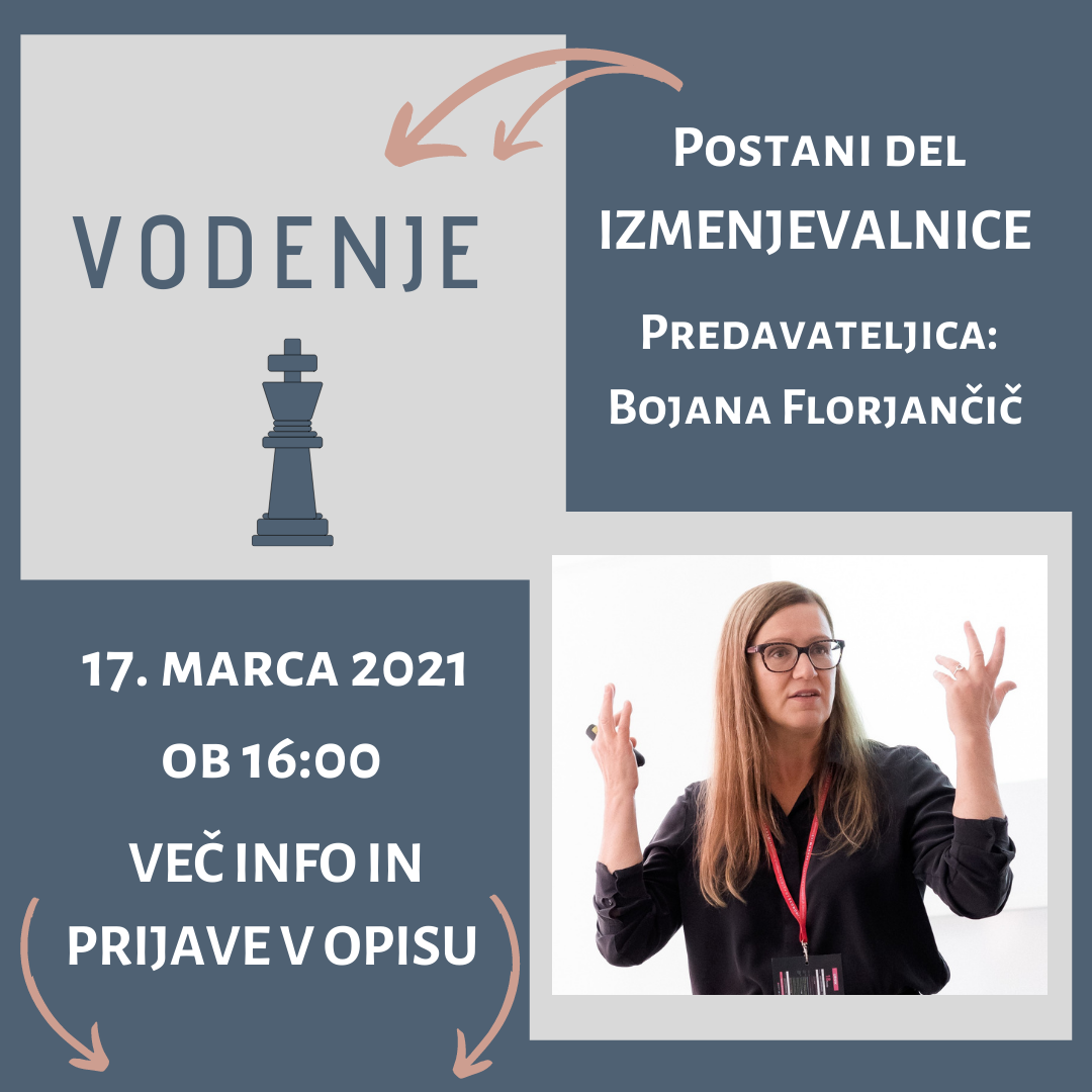 Če želite pridobiti nove veščine in poglobiti svoje znanje s pomočjo strokovnjakov iz različnih področij ter se naučiti pridobljeno znanje predate vrstnikom, se jim pridružite na naslednji delavnici Izmenjevalnice znanja. Delavnica na temo Vodenje bo na sporedu 17. marca 2021 ob 16:00.