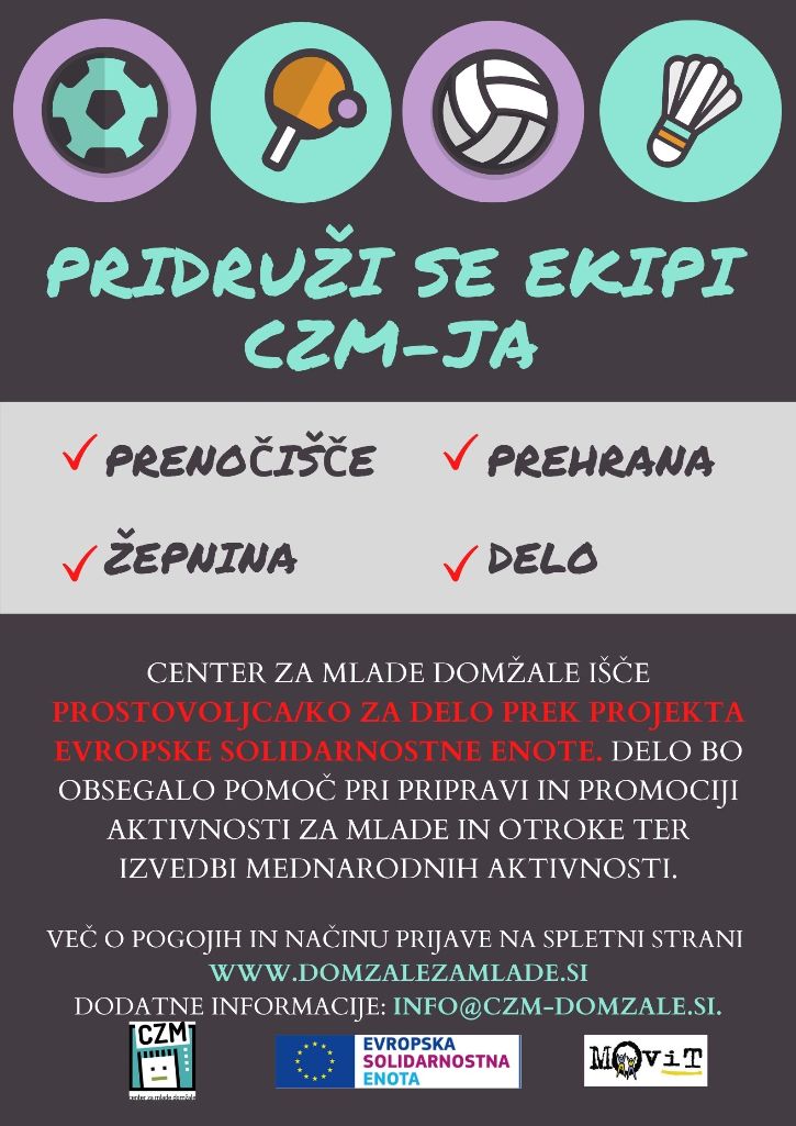 Center za mlade Domžale išče enega prostovoljca/ko, ki bi se ekipi pridružil za 4 mesece. Gre za projekt Evropske solidarnostne enote, v okviru katerega ima prostovoljec/ka krite stroške poti, prenočišče, prevoz, prehrano ter manjšo žepnino.
