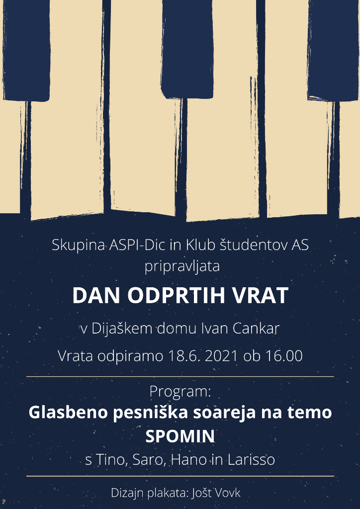 A vrnimo se za hip v petek, ko je skupina ASPI-Dic odprla vrata ustanove, v kateri gostuje. Dan je bil nekoliko prazničen, kajti razvojni projekt ASPI-Dic zaključuje prvo leto plodnega in uspešnega delovanja, bil pa je tudi deloven, saj so člani in članice Kluba ASPI dan izkoristili za krajši delovni sestanek. Prav študentje in dijaki so za Dan odprtih vrat pripravili program, v katerem so se predstavili z lastnimi literarnimi teksti ter drugimi oblikami kreativnega delovanja. Dogodek z imenom Soareja je v duhu pomena besede ponudil sproščeno druženje z branjem in petjem, tematska rdeča nit soareje pa je bila tokrat Spomin. Udeleženci so z zelo različnim naborom prispevkov iskali skrajne meje pomena te besede: od emotivno sentimentalnega, ki nas povezuje s preteklostjo, vsem minulim, izginulim ter bivajočim samo še v spominu, do nevrološkega, ki se ukvarja z vprašanjem, kako si naši možgani zapomnijo. Zastavili so si vprašanje, zakaj si kaj zapomnimo, kako si zapomnimo, česa si ne zapomnimo ter v odgovorih skozi svoje prispevke nakazali na močno navezavo spomina in glasbe, dotaknili so se mnemo-tehničnih pripomočkov, ki jih ljudje uporabljamo kot berglo spominu, pa tudi povsem neulovljivega načina, kako ohranjamo spomin na sanje, ki so na nek način še bolj minljive kot preteklost sama, čeprav lahko hkrati tudi močno določajo našo sedanjost in celo bodočnost. Člani Kluba študentov in dijakov ASPI obljubljajo, da bodo tovrstne debatno-umetniške soareje njihova stalnica, ki se bo odvijala mesečno, nabor in obravnavo tem pa bodo ohranjali na čim višji ravni. Dan odprtih vrat je deloma potekal tudi v okviru programa Nič več SAM – celostni program pomoči družinam z avtizmom, ki ga sofinancira Ministrstvo za zdravje.