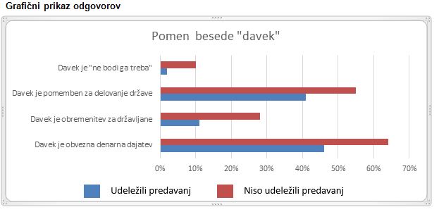 Mladi so pri tem vprašanju lahko podali več odgovorov. Da je imelo predavanje pozitiven učinek, kaže rezultat, da je davek kot »ne bodi ga treba« v skupini, ki ni poslušala predavanja, kot ustrezen odgovor izbralo 10% mladih, v skupini, ki je poslušala predavanje, pa samo 2%. Prav tako se je po poslušanju predavanj znižal delež tistih, ki menijo, da je davek obremenitev za državljane, in sicer z 28 % na 11 %.