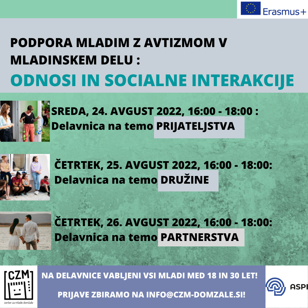Mladi med 18 in 30 vabljeni na delavnice, ki bodo potekale v Centru za mlade Domžale v okviru mednarodnega usposabljanja "Podpora mladim z avtizmom v mladinskem delu: odnosi in socialne interakcije". Praktični del usposabljanja bo odprt za vse mlade, ki jih zanimajo teme, še kako pomembne za vse mlade: prijateljstvo, družina in (intimna) partnerstva.