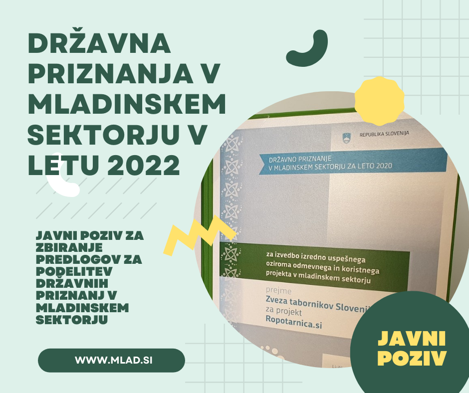 Urad za mladino je danes, 26. avgusta 2022, v Uradnem listu št. 112/2022 in na svoji spletni strani objavil Javni poziv za zbiranje predlogov za podelitev državnih priznanj v mladinskem sektorju v letu 2022.
