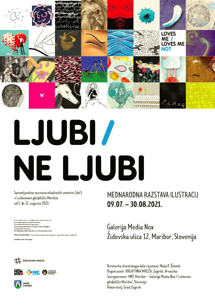 Vljudno vas vabijo na svečano otvoritev mednarodne razstave ilustracij Ljubi, ne ljubi, ki jo bo odprl veleposlanik Republike Hrvaške v Sloveniji mr. sc. Boris Grigić na kateri razstavljajo avtorji iz Slovenije, Avstrije, Nemčije, Turčije, Cipra, Združenih arabskih emiratov, Danske, Bosne in Hercegovine, Makedonije in Hrvaške, v petek, 9. julija 2021 ob 19.00 pred galerijo Media Nox v Mariboru.