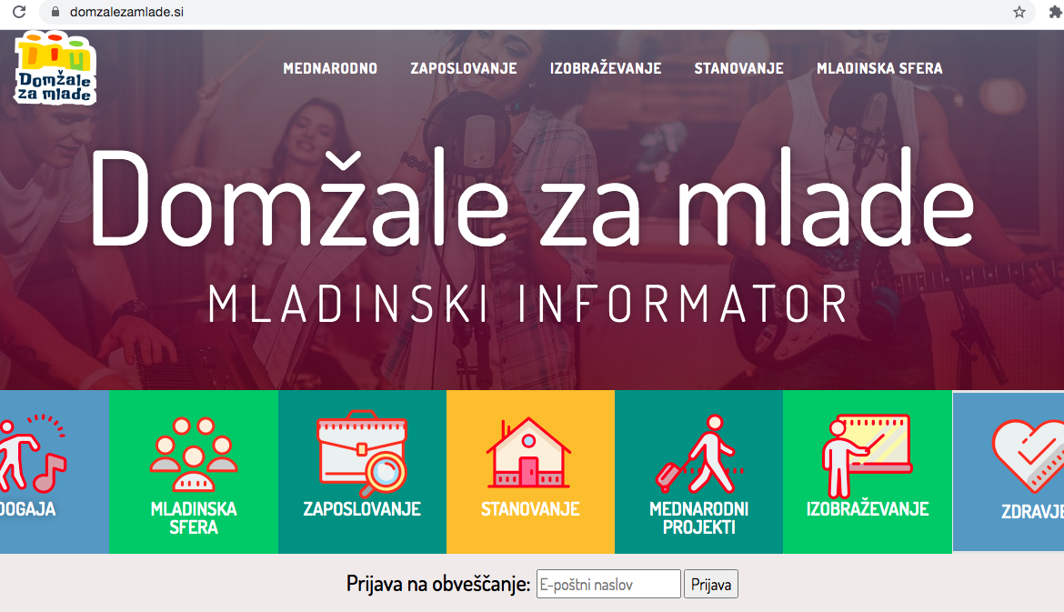 To željo so mladi izrazili pri pripravi Strategije za mlade, ki jo je leta 2018 sprejela občina Domžale. Na enem mestu imajo tako zbrane najrazličnejše informacije – od aktualnih dogodkov do različnih razpisov in priložnosti na raznolikih področjih, kot so izobraževanje, zaposlovanje, mednarodno, zdravje in stanovanjska problematika.