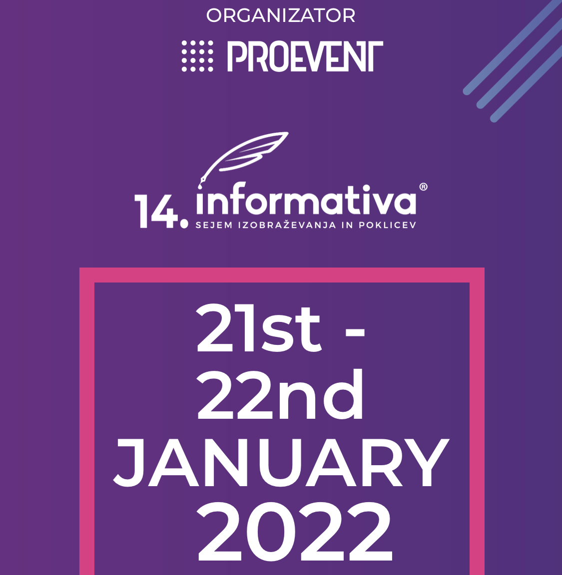 Že 14. Informativa, največji vseslovenski sejem izobraževanja in poklicev, bo 21. in 22. januarja 2022 tik pred uradnimi informativnimi dnevi ponovno V ŽIVO predstavila celovito paleto izobraževanj, možnosti zaposlovanja, poklice in prekvalifikacije.