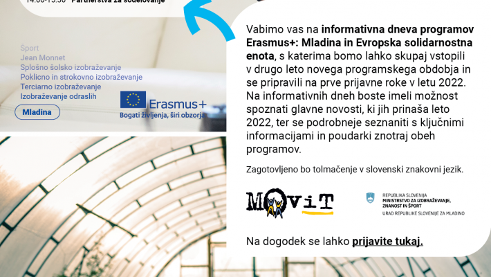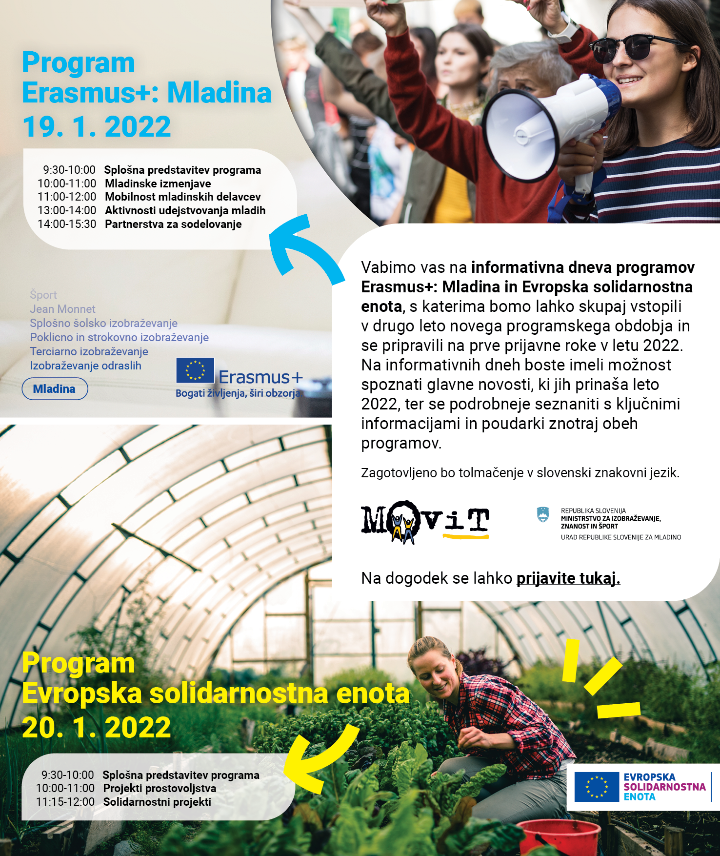 Zavod Movit vabi na spletna informativna dneva programov Erasmus+: Mladina in Evropska solidarnostna enota, ki bosta potekala 19. in 20. januarja 2022.
