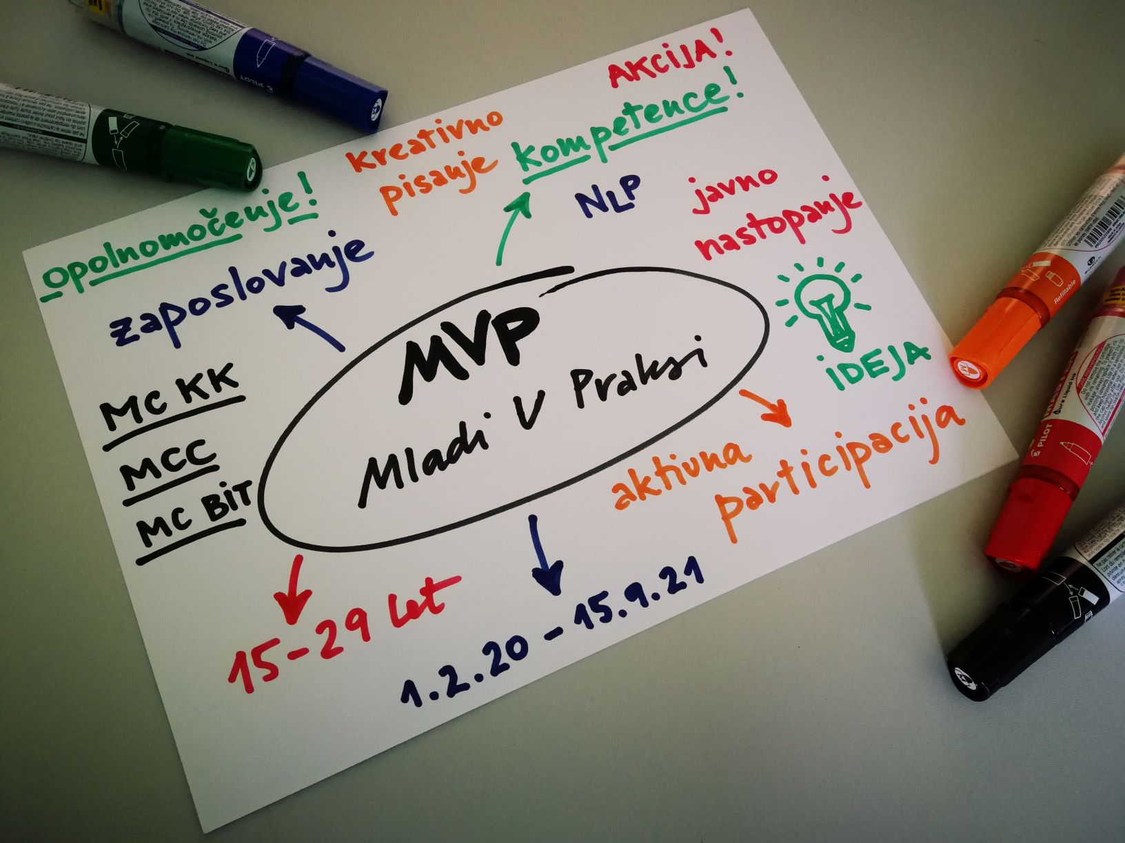 Namen projekta "MVP - Mladi v praksi" je mlade opolnomočiti, da postanejo najboljše verzije samih sebe. Preko osebnega stika z delodajalci, mreženja ter inovativnih vsebin in pristopov bodo udeleženci usposabljanj spoznavali sebe in svoje kompetence ter se opremili z znanji za učinkovito nastopanje na trgu dela s ciljem zaposliti se. Sodelovanje na okroglih mizah z odločevalci pa jim bo omogočilo aktivno participacijo in sooblikovanje ukrepov za mlade ter sodelovanje pri razvoju širše skupnosti.