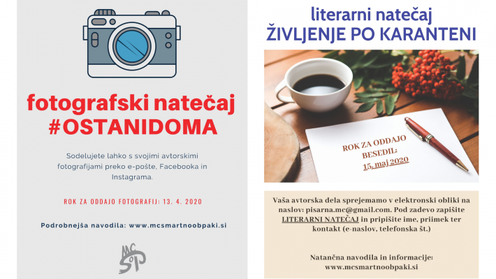 Ljubitelje in ustvarjalce pisane besede pa vabijo, da se preizkusite v pisanju pesmi ali kratke zgodbe. Na nagradnem literarnem natečaju z naslovom #Življenje po karanteni" lahko sodelujete vsi, ki pišete poezijo ali kratke zgodbe, in vsi, ki vas je začasna ohromitev javnega življenja pripravila do tega, da bi želeli svoje misli izliti na papir.