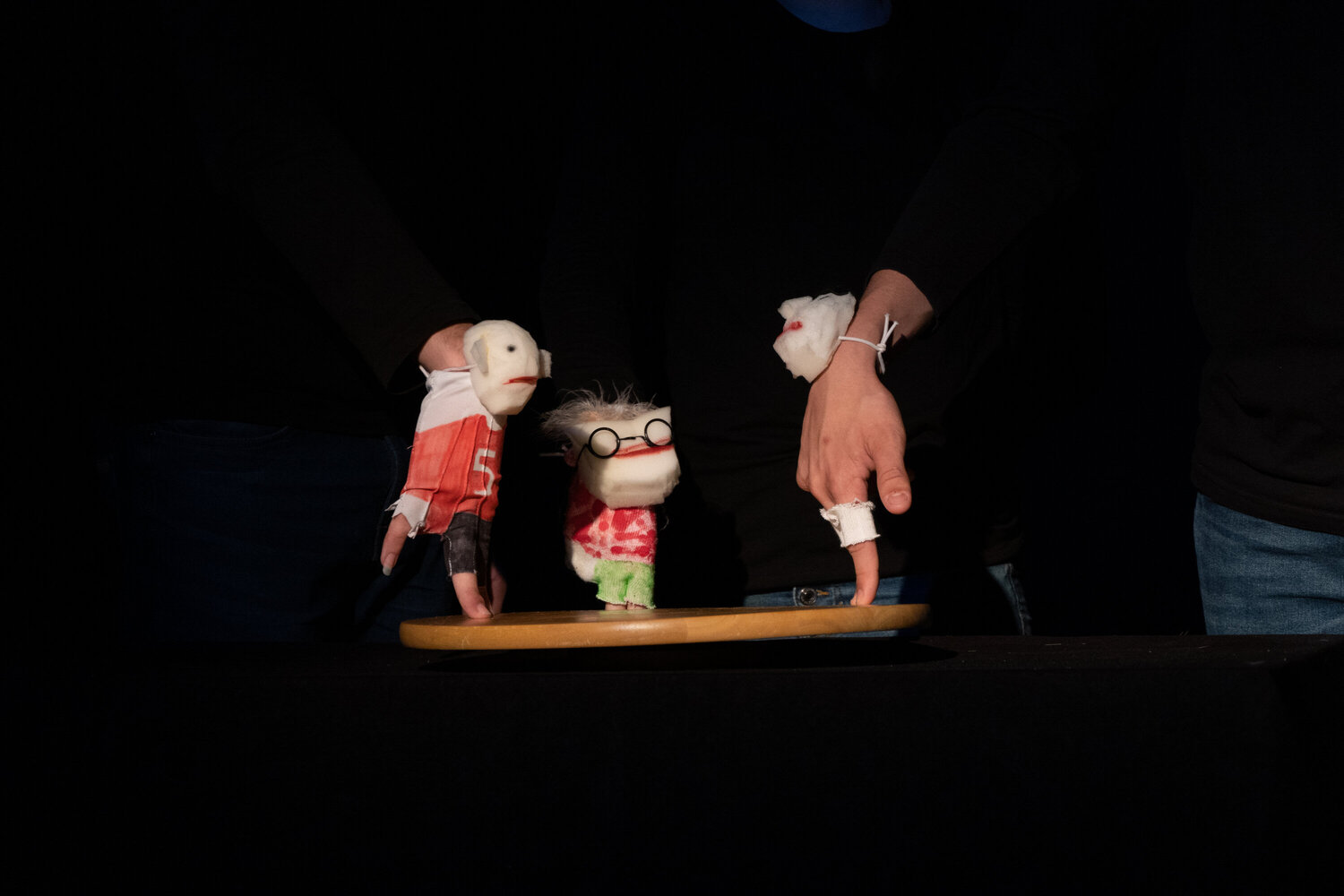 Andrej Dijak, Gašper Golob Rupnik, Zara Hrovat in Tia Kladivnik pod mentorstvom Irene Rajh s spretnim animiranjem informacij, mediacijskih veščin, lutk, svetlobe, senc, glasbe in prstov na rokah izvabljajo kapacitete imaginacije obiskovalcev predstave in jih nagradijo z vizualno očarljivo celoto, ki traja komaj 20 minut, a je tako polna situacij, likovnih elementov, glasbe in posledično simbolov in poant, da gledalca popolnoma prevzamejo.