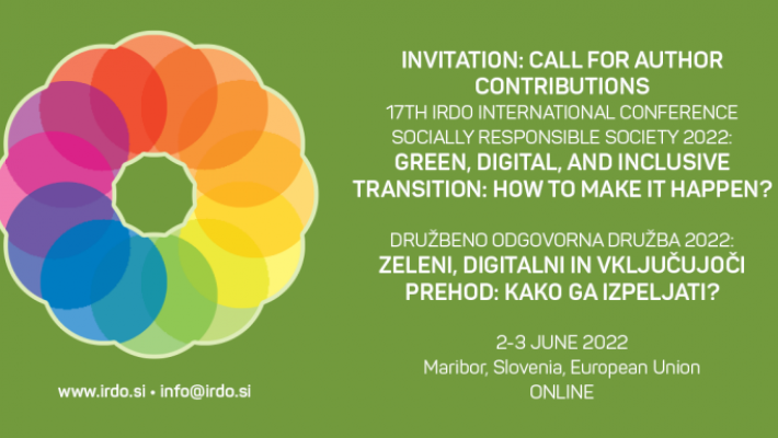 2. in 3. junija 2022 bo virtualno potekala 17. IRDO mednarodna konferenca DRUŽBENO ODGOVORNA DRUŽBA 2022: Zeleni, digitalni in vključujoči prehod: kako ga izpeljati?.