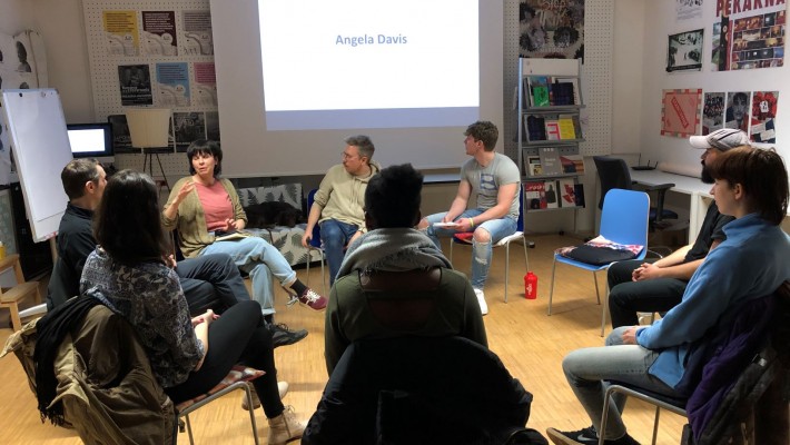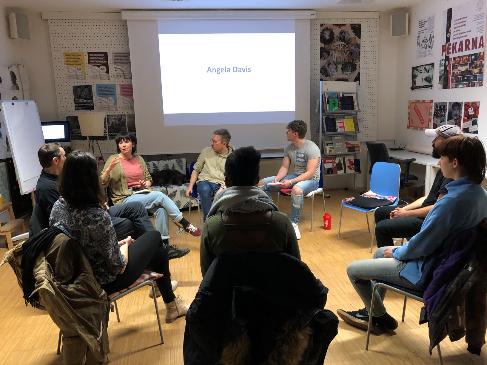 Dva dneva po mednarodnem dnevu žena so le-tega v Pekarni Magdalenske mreže obeležile_i s skupnostnim branjem v okviru programa Knjižnica tete Rose. Izbrale_i so poglavja iz knjige "Ženske, rasa in razred" politične aktivistke, pisateljice in profesorice Angele Davis.