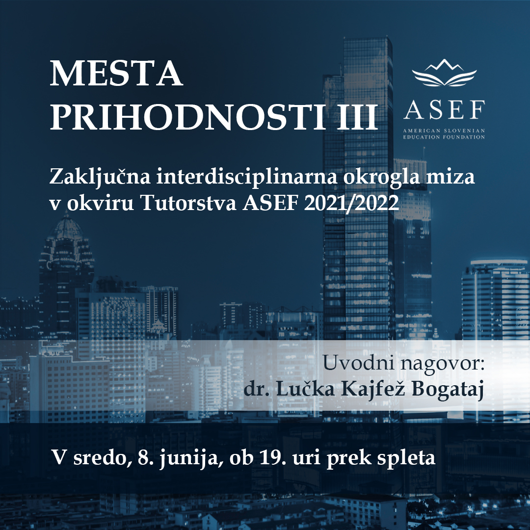 Ob zaključku študijskega leta 2021/2022 programa Tutorstvo ASEF Ameriško-slovenska izobraževalna fundacija (ASEF) organizira tretjo interdisciplinarno okroglo mizo z naslovom “Mesta prihodnosti III”.