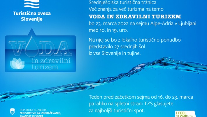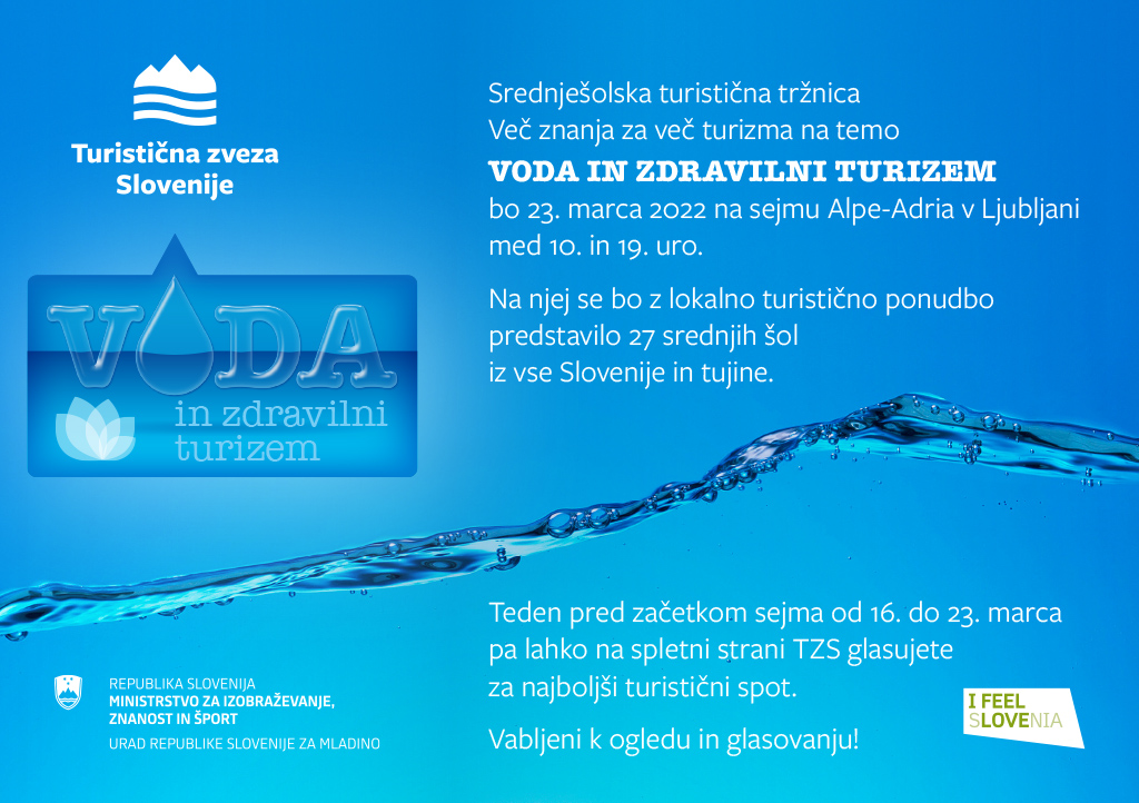 Turistična tržnica s predstavitvijo bo potekala prvi dan sejma Alpe-Adria v Ljubljani. V Dvorani A1 se bo predstavilo 24 srednješolskih in višješolskih ekip iz Slovenije in tujine (BIH, Hrvaška, Portugalska, Madžarska). Na sejmu bodo mladi na stojnicah predstavili zamisli za nove turistične produkte povezane z vodo in zdravilnim turizmom, posneli pa so tudi že promocijske spote. Zanje lahko na spletni strani Turistične zveze Slovenije glasujete od 16. do 23. marca 2022 do 17. ure. Srednja ali višja šola z najboljšim spotom po izbiri »ljudstva«, bo prejela posebno priznanje.