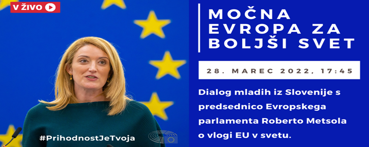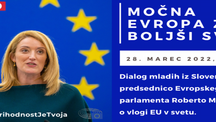 Pisarna Evropskega parlamenta v Sloveniji vabi k spremljanju razprave predstavnikov mladih iz Slovenije s predsednico Evropskega parlamenta, Močna Evropa za boljši svet, ki bo potekala danes, v ponedeljek, 28. marca 2022, ob 17.45.