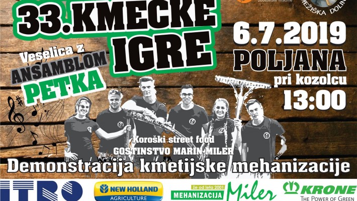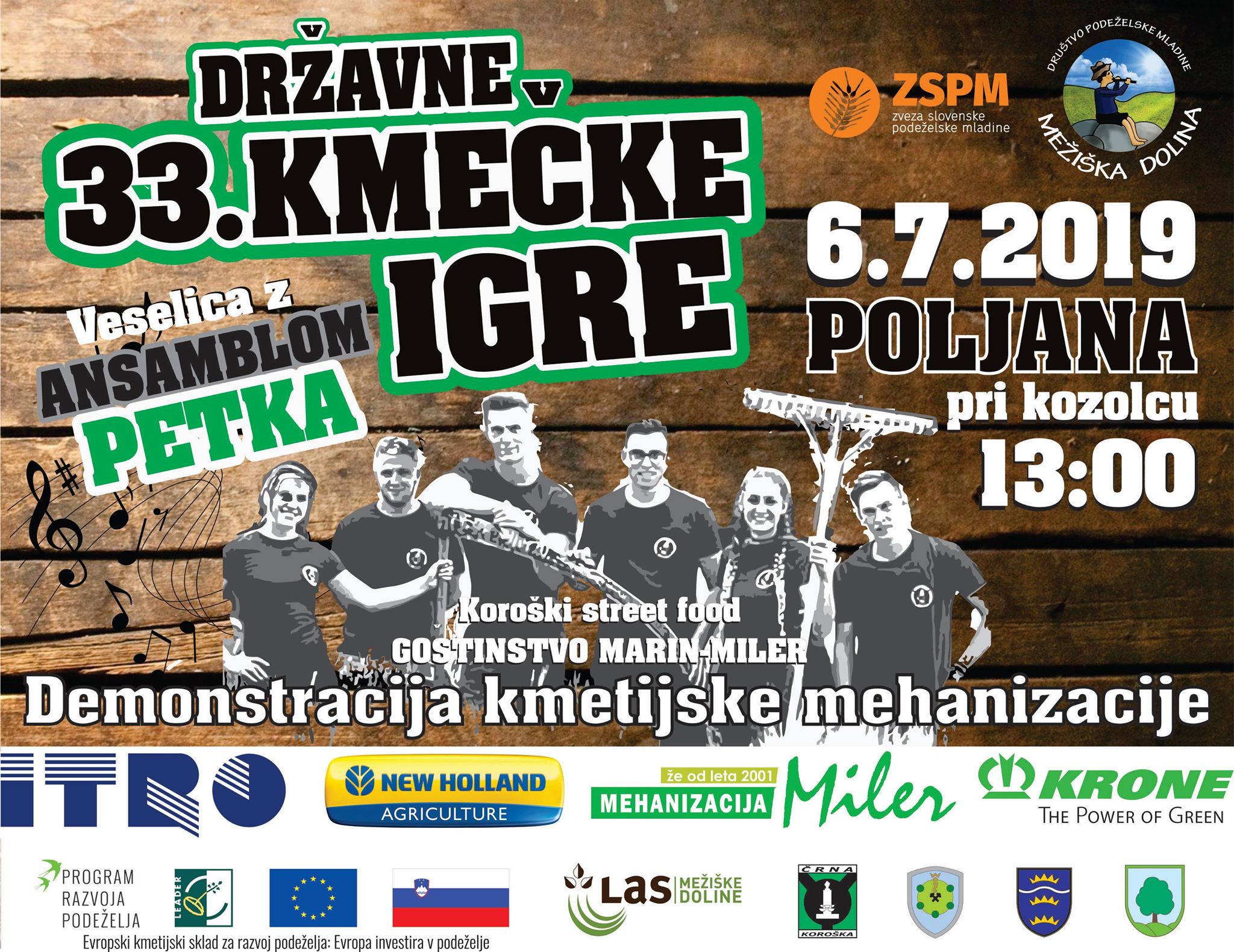 Kmečke igre bodo potekale v soboto, 6. julija, 2019 na Poljani poleg kozolca (Poljana 20a, 2391 Prevalje), z uradnim pričetkom ob 13.00 uri. Iger se bo udeležilo 22 ekip podeželske mladine iz Slovenije in 2 iz tujine. S svojo ekipo bo sodelovalo tudi Ministrstvo za kmetijstvo, gozdarstvo in prehrano z ministrico Aleksandro Pivec na čelu.