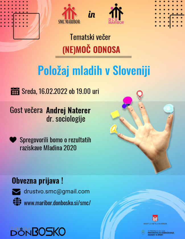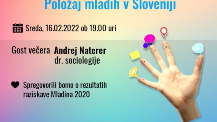 Prvi letošnji tematski večer bo v sredo, 16.02. 2022 ob 19.00. Predavanje nosi naslov POLOŽAJ MLADIH V SLOVENIJI, kjer bomo predstavili rezultate raziskave MLADINA 2020. Gost večera je znan strokovnjak, antropolog in sociolog, doc. dr. ANDREJ NATERER.