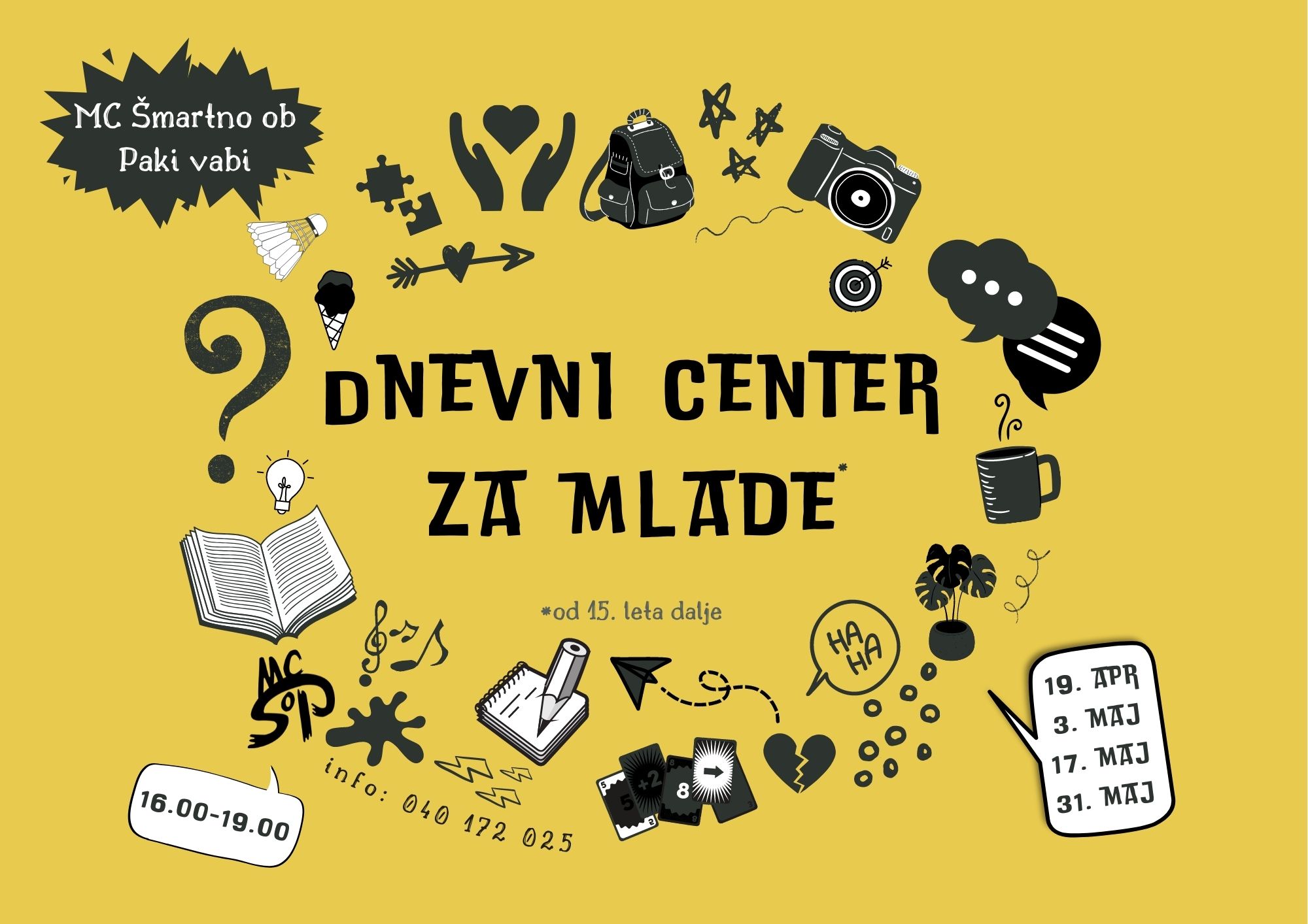 Dnevni center bo zaenkrat »odprt« vsak drugi torek (naslednjič bo to 19. aprila) od 16. do 19. ure, glede na želje in potrebe pa se lahko termini v prihodnje prilagodijo. Lepo vabljeni vsi mladi med 15. in 29. letom.