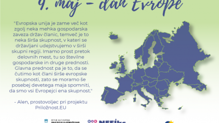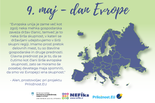 "Evropska unija je zame več kot zgolj neka mehka gospodarska zaveza držav članic, temveč je to neka širša skupnost, v kateri se državljani udejstvujemo v širši skupni regiji. Imamo prost pretok delovnih mest, tu so številne gospodarske in druge prednosti. Glavna prednost pa je to, da se čutimo kot člani širše evropske skupnosti, zato se moramo še posebej devetega maja spomniti, da smo vsi Evropejci ena skupnost." - Alen, prostovoljec pri projektu Priložnost.EU