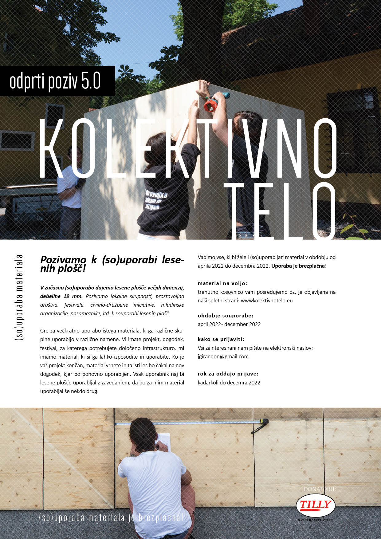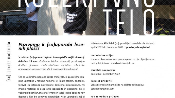 Ekipa Kolektivno telo v začasno (so)uporabo dajejo lesene plošče večjih dimenzij, debeline 19 mm. Pozivajo lokalne skupnosti, prostovoljna društva, festivale, civilno-družbene iniciative, mladinske organizacije, posameznike, itd. k souporabi lesenih plošč.