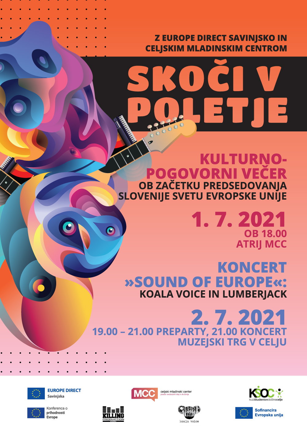 Drugi dogodek, ki ga pripravljajo na EUROPE DIRECT Savinjski pa je SOUND OF EUROPE, ki se bo odvijal 2. julija, od 19:00 dalje, in bo sestavljen iz dveh delov. Prvi del bo namenjen pre-party programu (kulturni program bo podrobneje opisan v prihodnjih dneh na Facebook dogodku) ter promociji EU držav članic in lokalnih projektov, sofinanciranih s strani EU, hkrati pa tudi splošnemu informiranju o Evropski uniji. V drugem delu, s pričetkom ob 21:00, pa bodo sceno prevzeli in na njej zažigali Koala Voice in Lumberjack.