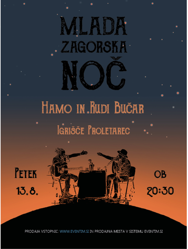 Istega dne ob 20.30 bo na igrišču Proletarc potekala tudi MLADA ZAGORSKA NOČ, na kateri bosta za odlično vzdušje poskrbela HAMO IN RUDI BUČAR, ki sta edinstvena kombinacija in izjemen duet izvrstnih glasbenikov. Na koncertnem doživetju bosta igrala kitari, pela in ves večer ustvarjala vzdušje, ki bo trajalo tudi po koncertu.