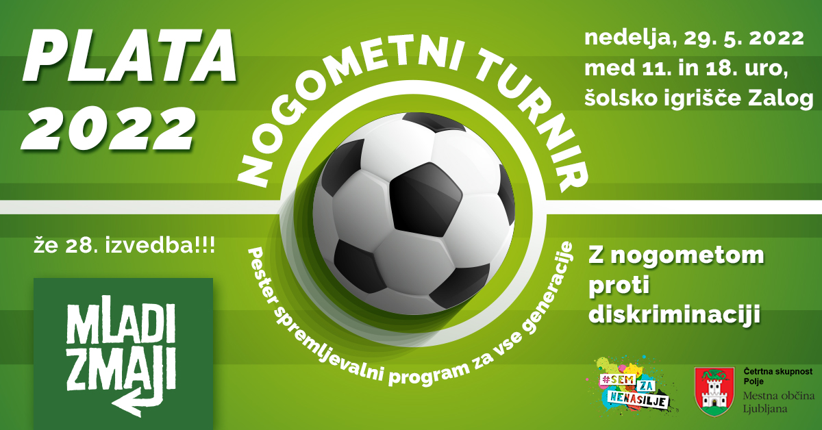 Mladi zmaji znova vabijo na Plato - z nogometom proti diskriminaciji 2022, tradicionalni celodnevni družabno rekreacijski dogodek Mladih zmajev Zalog v Zalogu, ki se bo odvil v nedeljo, 29. 5. med 11. in 19. uro. na igrišču OŠ Zalog na Cerutovi. Na že 28. ponovitvi Plate ne bo manjkalo dobre družbe, glasbe in športnega vzdušja. Rdeča nit dogodka bo tudi letos nogometni turnir pospremljen z bogatim spremljevalnim programom.
