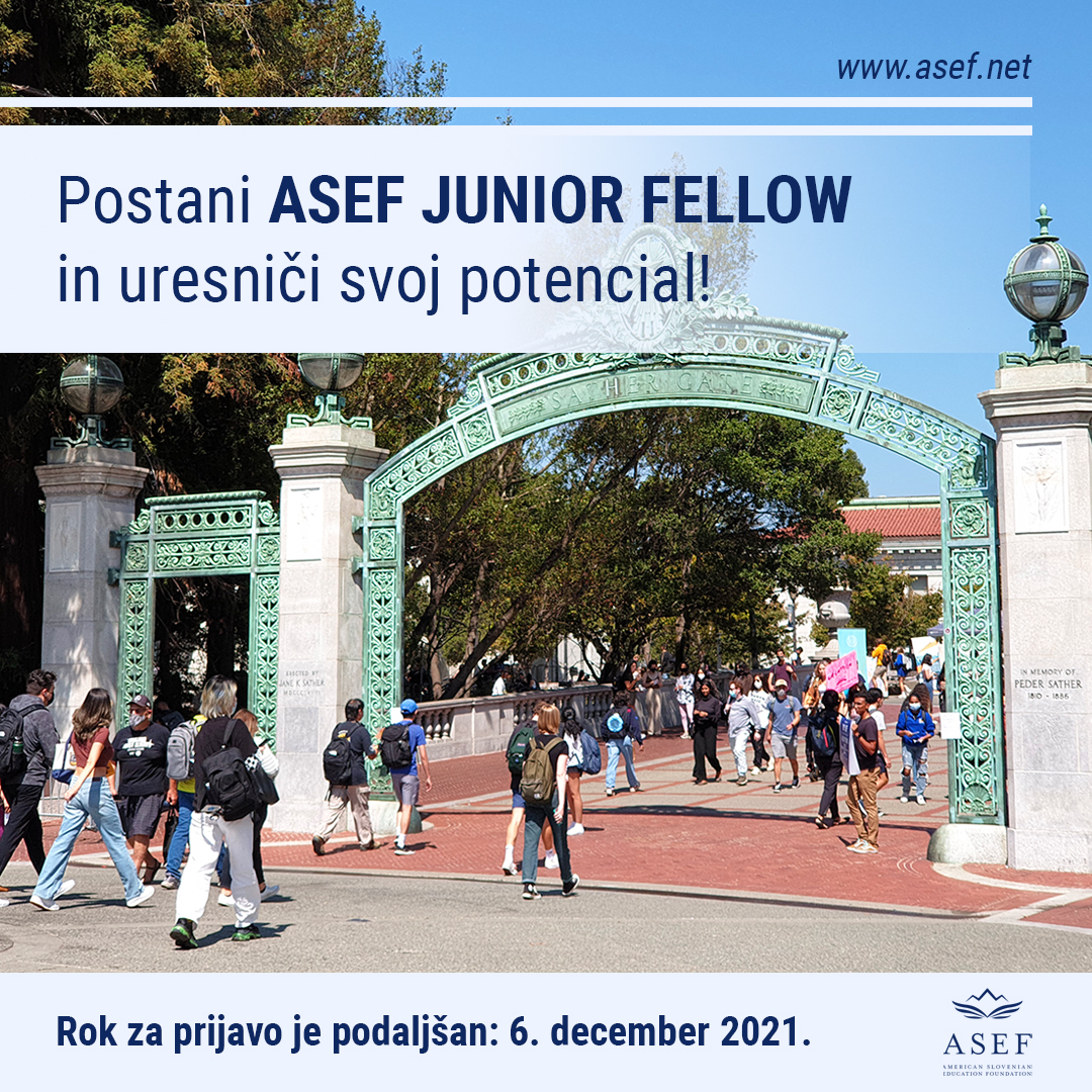 Ameriško-slovenska izobraževalna fundacija (ASEF) je objavila razpis 2022 ASEF Junior Fellows - Research Abroad, ki slovenskim študentkam in študentom omogoča priložnost 10-tedenskega raziskovalnega obiska v tujini na prestižnih univerzah po svetu (npr. na Univerzi Harvard, Univerzi Stanford, Univerzi Princeton, Univerzi Cambridge) pod mentorstvom slovenskega profesorja/-ice na področju zanimanja ter sodelovanje pri nadaljnjih raziskovanjih in 3-letno vključenost v ASEF aktivnosti v Sloveniji ter drugod po svetu (npr. v program ASEF tutorstvo, ASEF Speaker Series, ASEF mladi umi, ASEF izjemne zgodbe, bralne krožke).