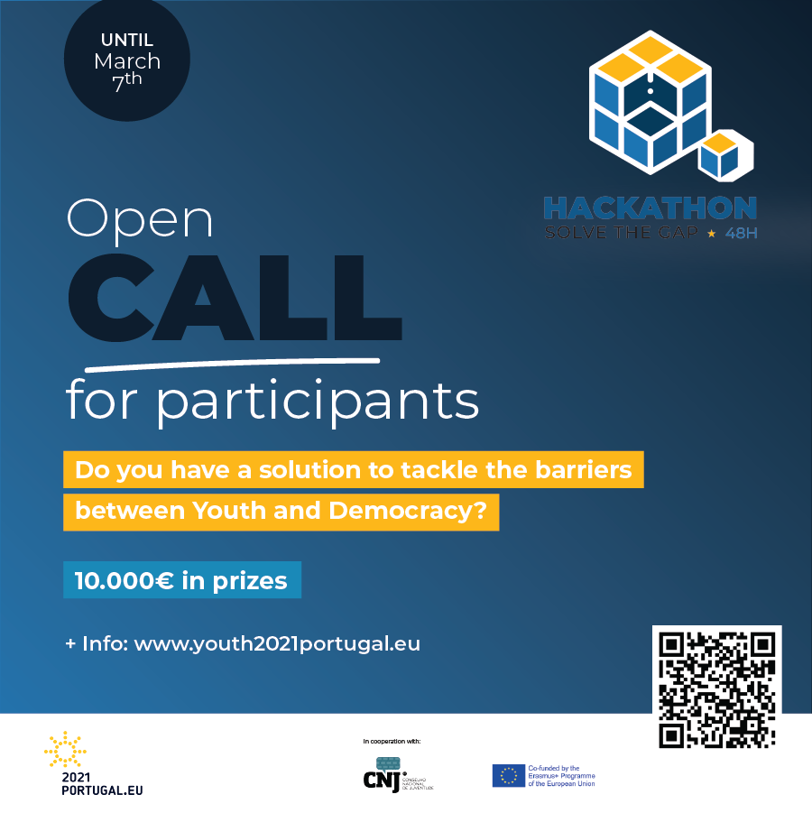 Portugalsko ministrstvo za izobraževanje in Mladinski svet Portugalske organizirata 48-urni hackathon, ki bo potekal v obliki spremljajočega dogodka ob Evropski mladinski konferenci na Portugalskem, ki bo potekala med 12. in 15. marcem 2021 v mestu Vila Nova de Gaia na Portugalskem.