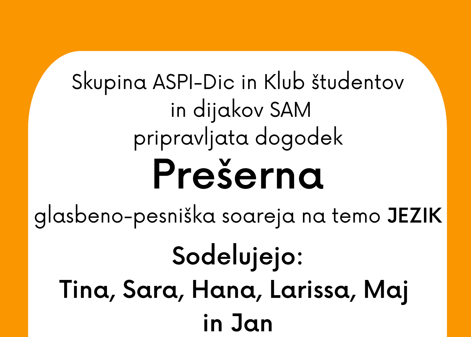 V petek 4.2., tik pred dnevom kulture, sta projektna skupina ASPI-Dic ter Klub študentov in dijakov SAM organizirala precej izviren način praznovanja. Priredili so bralno srečanje z naslovom Prešerna soareja, ki pa se ni omejevala samo na slovensko kulturo, Prešerna, poezijo ali umetnost kot tako. Svoj razmislek in prispevke so sodelujoči zastavili na temo ''jezik'' in tako so Jan, Hana, Tina, Larissa, Sara in Maj zbranemu omizju prebrali prispevke v različnih vrstah jezikov: umetnem – esperanto, mrtvem – latinščina, v novi oz. sodobni inačici latinščine – v angleščini, razmišljali so o dvojezičnosti – o materinščini in očetovščini, seveda pa ni manjkala niti najbolj žlahtna slovenska beseda – Prešernova poezija.