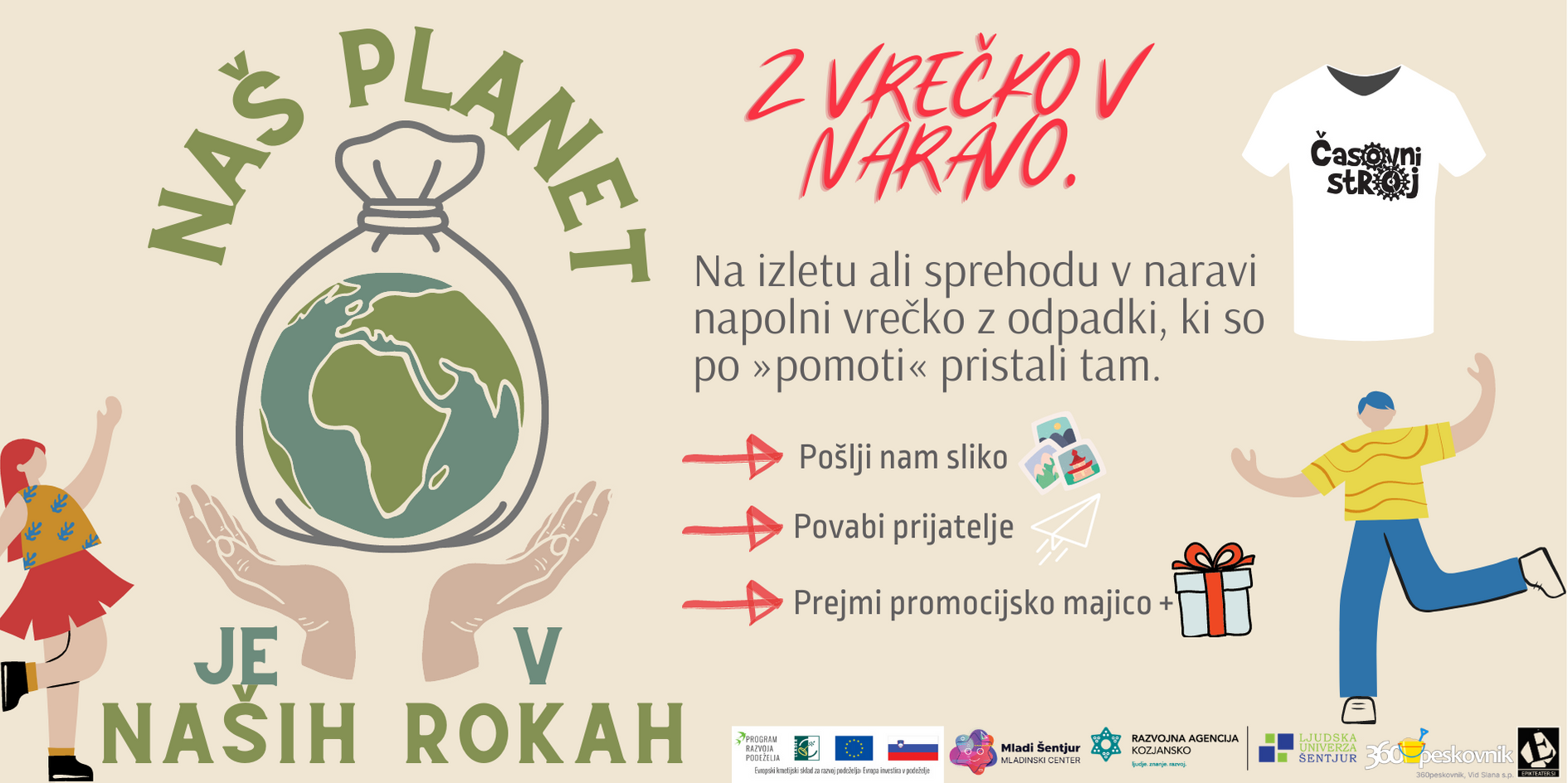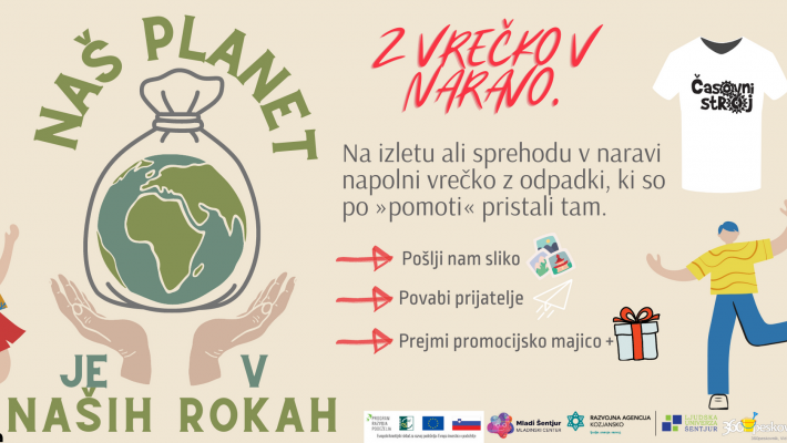 Zaradi vse več ustvarjenih odpadkov, tudi v naravi pristane vse več smeti. A zakaj bi to samo nemo gledali, če lahko aktivno pristopimo k reševanju problema. Pridruži se Mladinskemu centru Šentjur pri akciji "Z vrečko v naravo". Vse, kar storiš je, da vzameš na sprehod, izlet ali pa na pot, recimo do knjižnice, vrečko in jo sproti napolniš z odpadki, ki so se po ''pomoti'' znašli v naravi. Tako lahko združiš svojo rekreacijo ali načrtovane obveznosti z dobrim dejanjem.