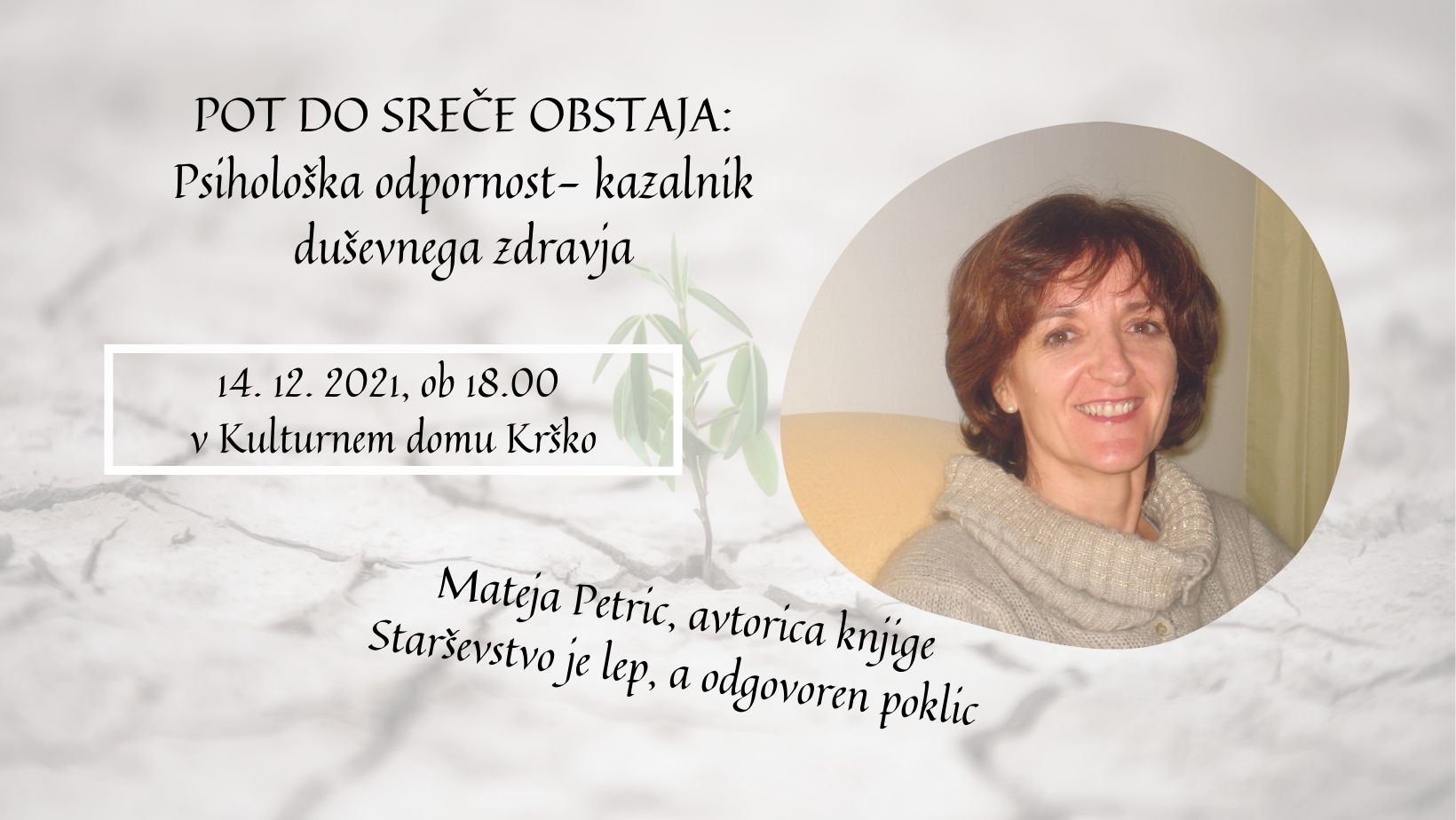 V torek, 14. 12. 2021, ob 18. uri v Kulturnem domu Krško ponovno pripravljajo predavanje Pot do sreče obstaja, z naslovom Psihološka odpornost - kazalnik duševnega zdravja.