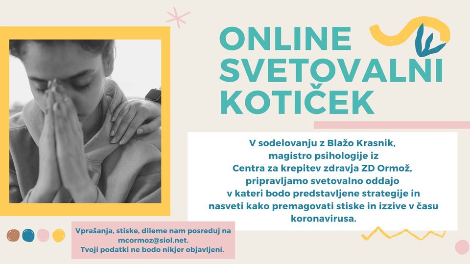 Da bi zagotovili podporo mladim, ki se v času epidemije soočajo z različnimi stiskami, je Mladinski center Ormož organiziral Online svetovalni kotiček, v okviru katerega lahko na njihov e-naslov: mcormoz@siol.net pošljete vaša vprašanja ali opišete stiske, s katerimi se soočate, pa vam bodo pomagali do strokovnega nasveta. Sodelujejo z magistro psihologije, Blažo Krasnik, ki je zaposlena v Centru za krepitev zdravja Zdravstvenega doma Ormož, in pripravlja nasvete za izpostavljene težave mladostnikov.