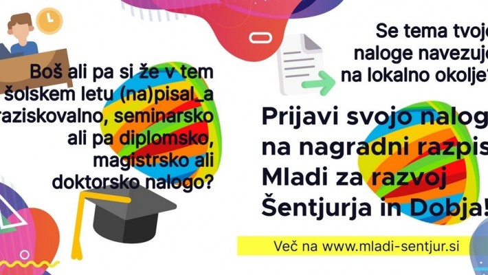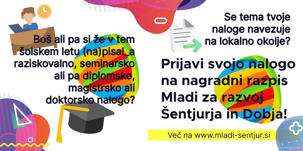 Razvojna agencija Kozjansko v sodelovanju z Občino Šentjur, Občino Dobje in Študentskim klubom mladih Šentjur objavlja razpis "Mladi za razvoj Šentjurja in Dobja" za prijavo raziskovalnih nalog v šolskem letu 2020/2021. Namenjen je osnovnim šolam, srednješolcem, študentom in drugim mladim, do vključno 29 let, ki imajo stalno prebivališče v občinah Šentjur in Dobje ali pa se šolajo v omenjenih občinah.