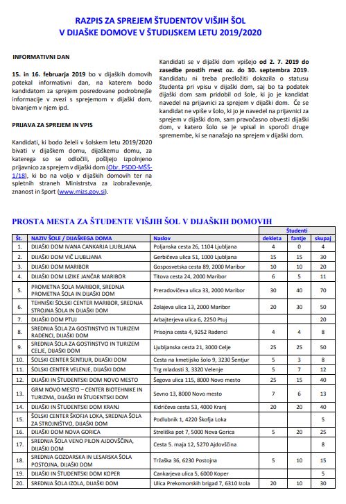 Hkrati z Razpisom za vpis v višje strokovno izobraževanje je objavljen tudi razpis za sprejem študentov višjih šol v dijaške domove.