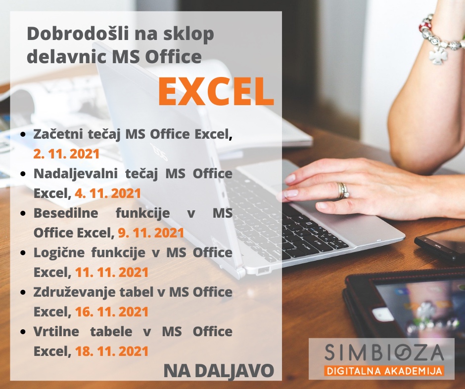 Ker med osnovno digitalno znanje, ki omogoča uspešno opravljanje delovnih (pa tudi študijskih obveznosti) zagotovo sodi znanje programa MS Office Excel so v okviru trajnostnega projekta Simbioza Digitalna Akademija pripravil sklop delavnic Excel specialist, ki so namenjene začetnikom, kot tudi naprednim uporabnikom.