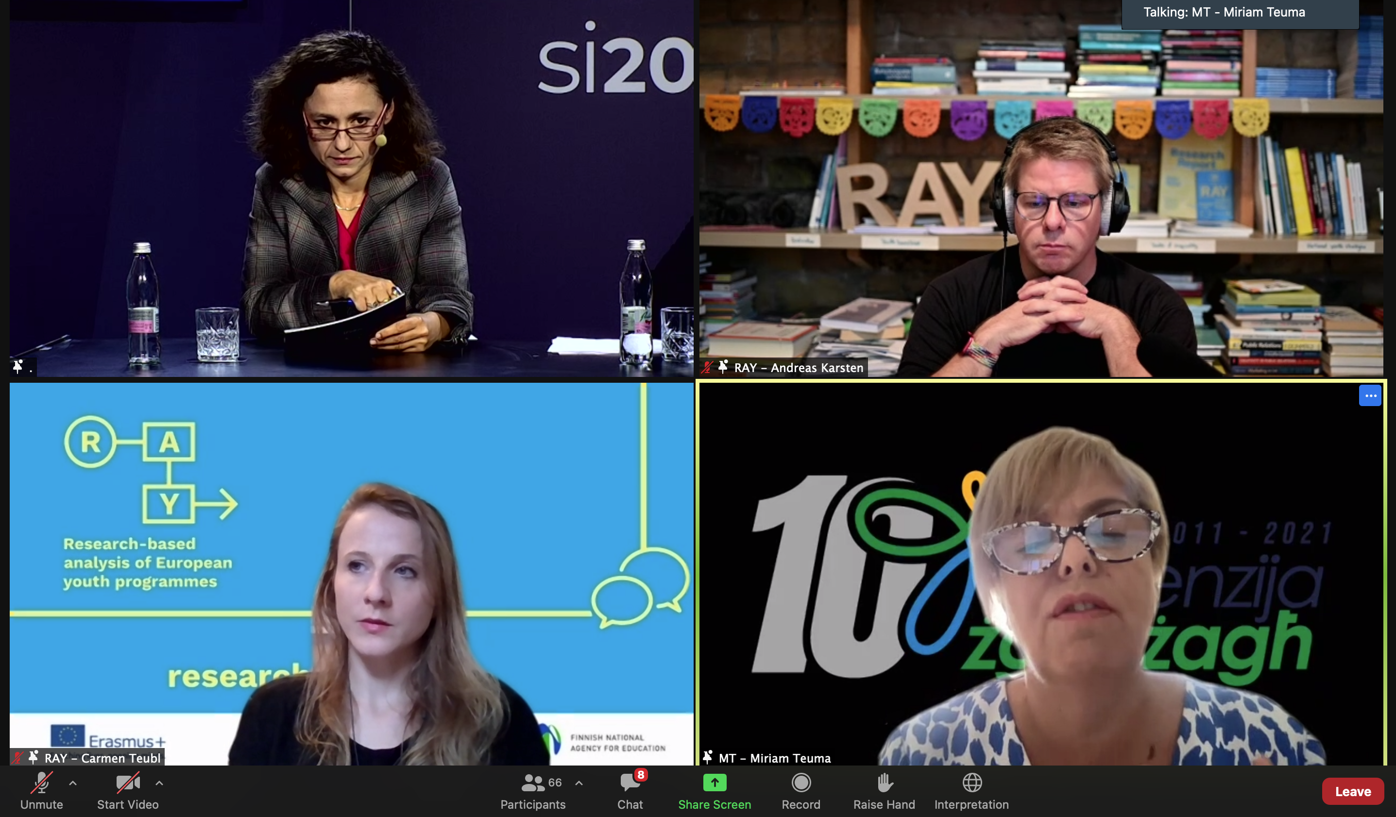 Na srečanju so bili predstavljeni tudi izsledki raziskave RAY mreže evropskih raziskovalcev o programih financiranja v zvezi z vključevanjem mladih v programe okrevanja po epidemiji. Ugotovili so, da je število mladinskih delavcev upadlo, epidemija pa je spremenila tudi naravo mladinskega dela. V letu 2020 so zaznali spremembe na različnih področjih, med katerimi izstopajo predvsem spremembe na področju prostorov za mlade, ki so se skozi pandemijo občutno skrčili. Rezultati raziskave so pokazali, da so mladi, vključeni v mladinsko delo v času pandemije, v tem času pridobili različne kompetence in znanja. Vključevanje in povezovanje jim je pomagalo, da so lažje preživeli čas strogih ukrepov, hkrati pa so se z mladinskim delom naučili prepoznavati lažne novice, se začeli zavedati resnosti te zdravstvene krize, ob tem pa se zabavali in s tem lažje prebrodili pandemijo.