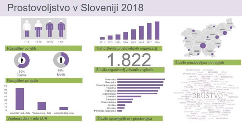 Analiza podatkov, ki so jih zagotovile prostovoljske organizacije in organizacije s prostovoljskim programom, vpisane v vpisnik prostovoljskih organizacij in organizacij s prostovoljskim programom na Ajpesu (skupaj 1.822 prostovoljskih organizacij in organizacij s prostovoljskim programom), je pokazala, da je skupno število prostovoljcev, ki so opravljali prostovoljsko delo 244.304, opravili pa so 9.903.798 ur prostovoljskega dela (9.466.281 ur v letu 2017), od tega v organizacijah s prostovoljskim programom 196.082 prostovoljskih ur (184.086 ur v letu 2017) in v okviru prostovoljskih organizacij 9.707.716 ur opravljenega prostovoljskega dela.