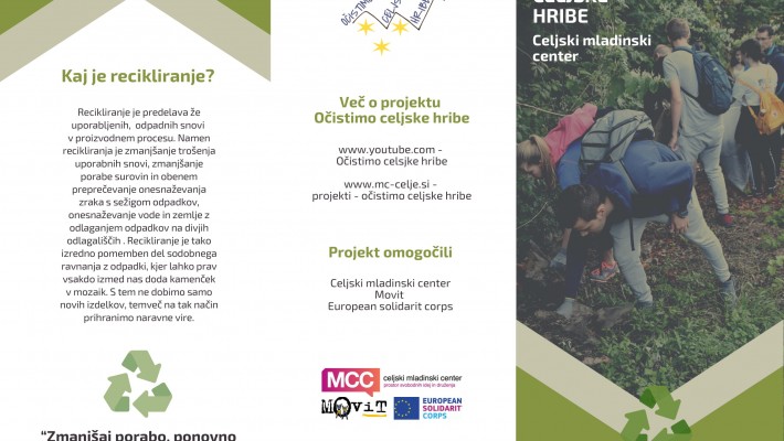 Celjski mladinski center je na lanskoletni aprilski prijavni rok programa Evropske solidarnostne enote prijavil projekt "Očistimo celjske hribe". Projekt je odgovor na problematiko onesnaženosti lokalnega okolja, predvsem v količini zavrženih odpadkov v okolici sprehajalnih poti. Glavna aktivnost projekta je bila enodnevna čistilna akcija, ki je 13. septembra lansko leto potekala po priljubljenih celjskih poteh, ki so z vidika onesnaženosti prav najbolj ogrožene.