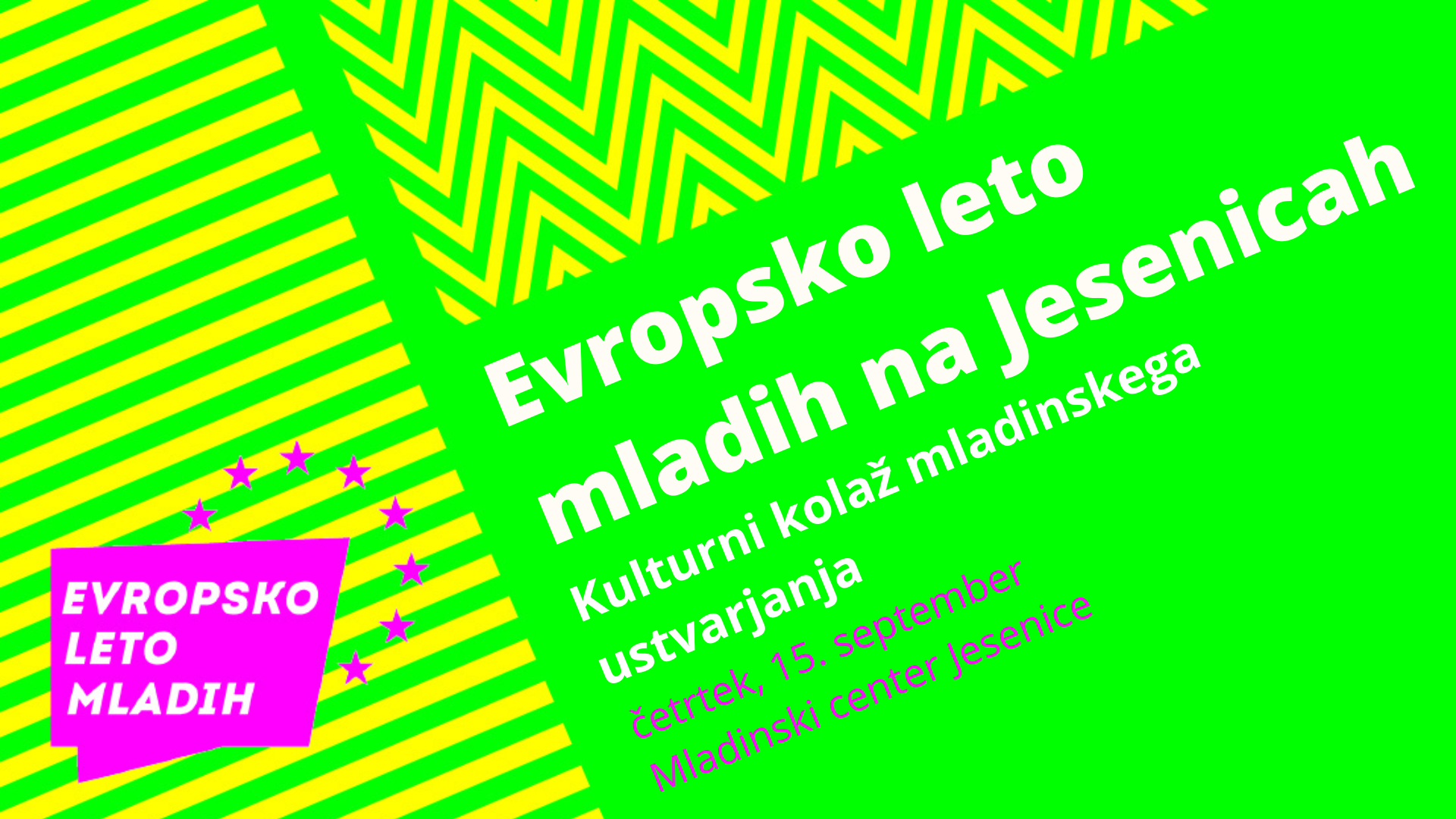 Predstavništvo Evropske komisije v Sloveniji in Mladinski center Jesenice vas vabita na EVROPSKO LETO MLADIH NA JESENICAH Kulturni kolaž mladinskega ustvarjanja v četrtek, 15. septembra 2022, med 10.00 in 13.00 uro v Mladinskem centru Jesenice, Ulica Viktorja Kejžarja 22, 4270 Jesenice.