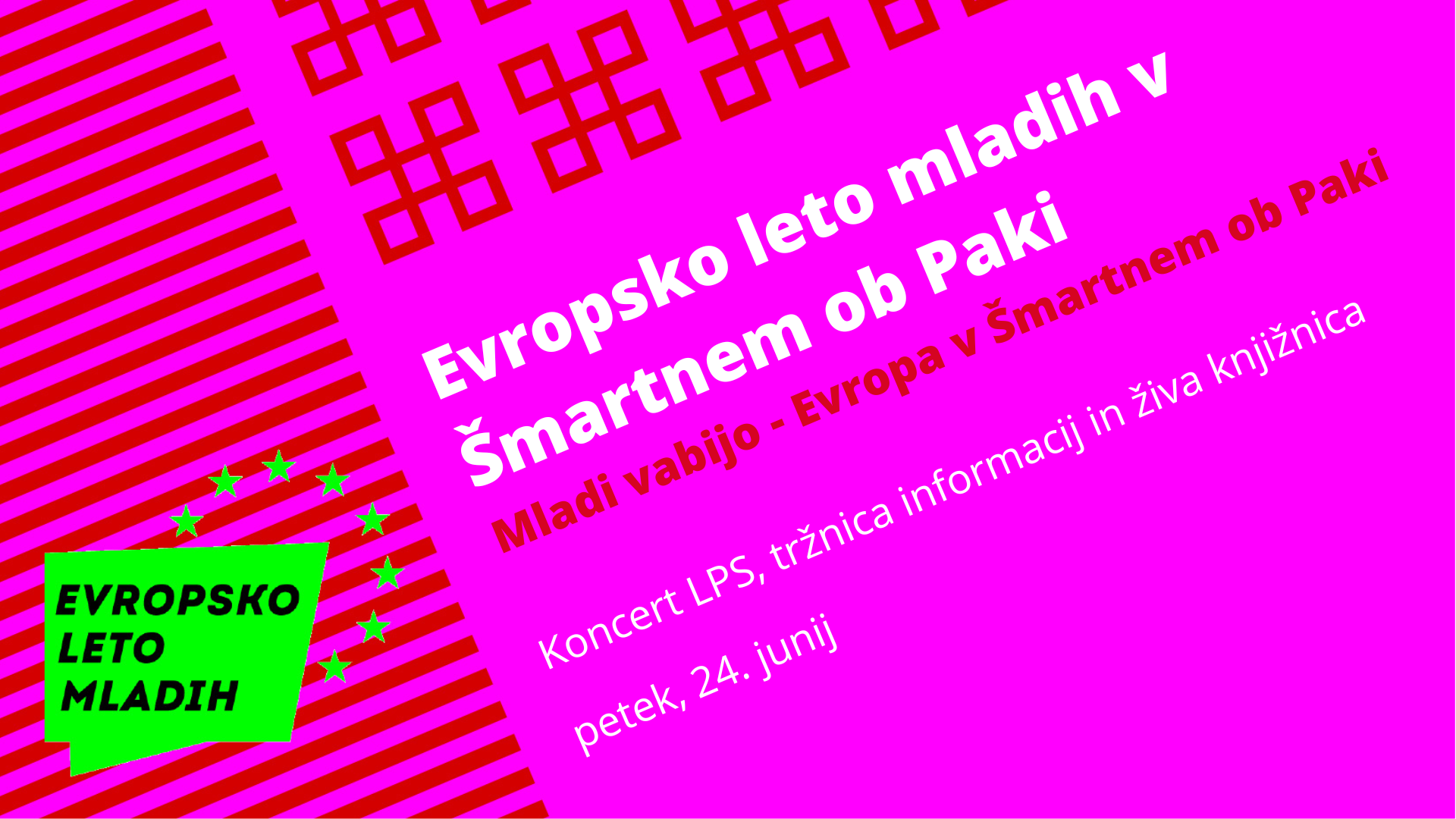 Praznovanje evropskega leta mladih se bo v Šmartnem ob Paki začelo z občinsko proslavo ob dnevu državnosti v organizaciji mladih. Nadaljevalo se bo s Čakalnico – tržnico informacij o lokalni ponudbi mladinskih in drugih organizacij, o trajnostnih praksah, iskanjem poti do bolj krepkega duševnega zdravja, iz prve roke pa bomo spoznavali tudi Evropsko unijo. V Živi knjižnici boste poklepetali s tremi »knjigami«, osebnostmi, ki jih boste lahko povprašali o evropskem prostovoljstvu in vključevanju v evropske programe za mlade. Za konec druženja pa sladica: koncert Za kon'c šole z glasbeno skupino LPS.