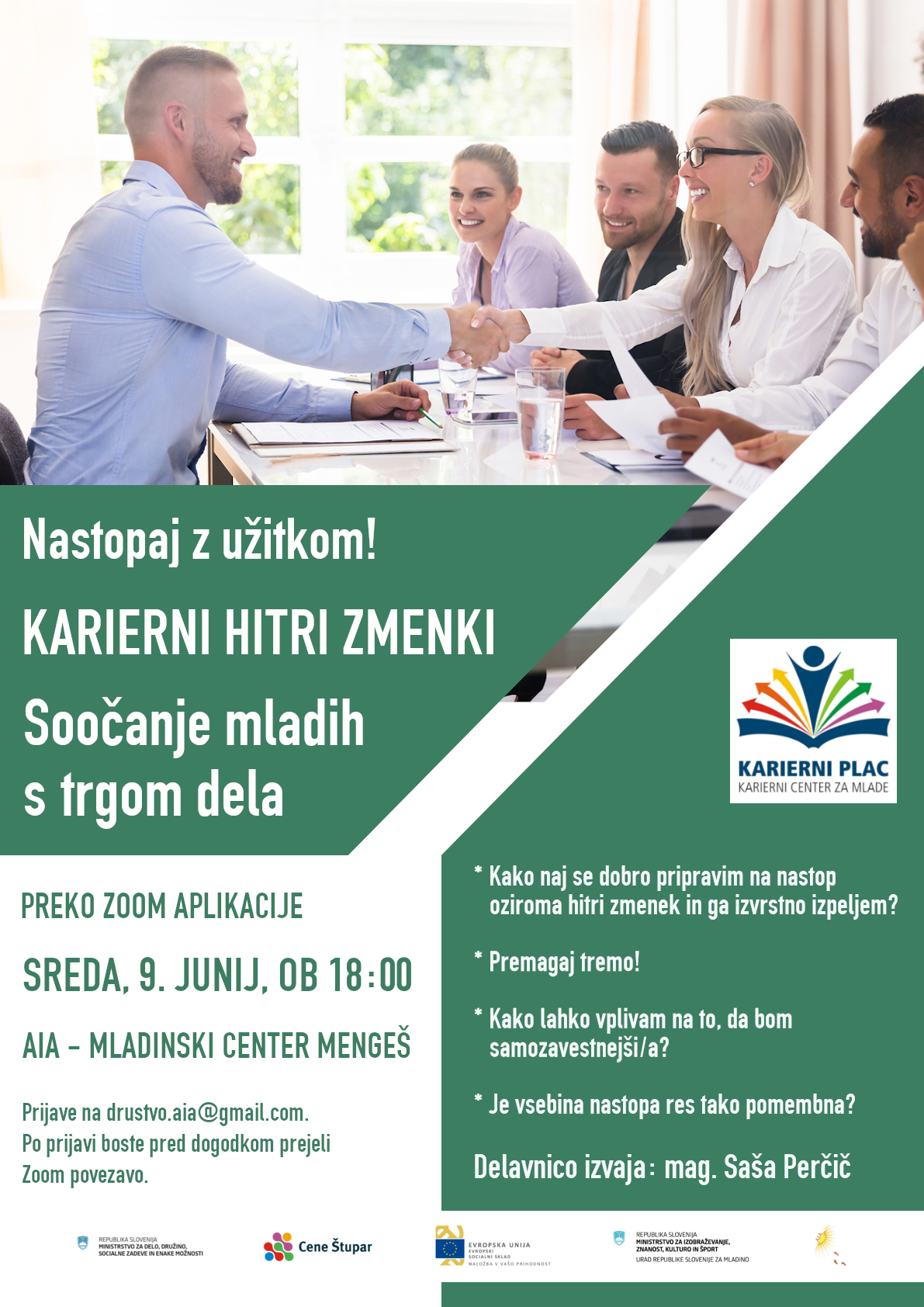 Karierni Plac - Karierni center za mlade in Društvo AIA - Mladinski center Mengeš vabita na KARIERNE HITRE ZMENKE.