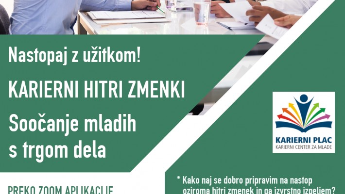 V drugem delu srečanja pa boste lahko pridobljeno znanje preizkusili na KARIERNIH HITRIH ZMENKIH, ki bodo kot vaja za razgovor z delodajalcem.