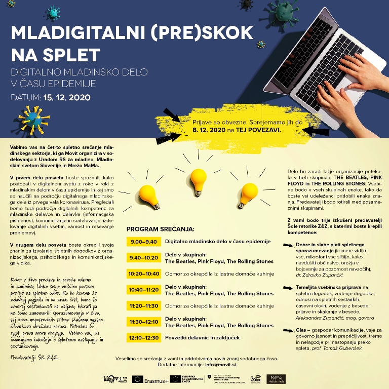 Vabimo vas na četrto spletno srečanje mladinskega sektorja, ki ga Movit organizira v sodelovanju z Uradom RS za mladino, Mladinskim svetom Slovenije in Mrežo MaMa. Tokratno srečanje bo potekalo v torek, 15. decembra, med 9.00 in 12.30 uro.