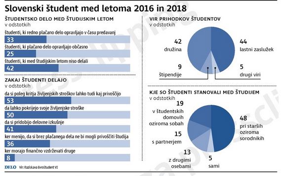 Med študijem dela več kot polovica študentov, redno jih dela tretjina, občasno pa četrtina. 48 odstotkov jih opravlja delo, ki ni povezano s študijem, le 22 odstotkov študentov pa je ocenilo, da je delo, ki ga opravljajo, zelo povezano s študijem. Za obvezne študijske dejavnosti študentje v Sloveniji porabijo v povprečju 20 ur tedensko, za individualni študij 17 ur, za delo pa 14 ur.