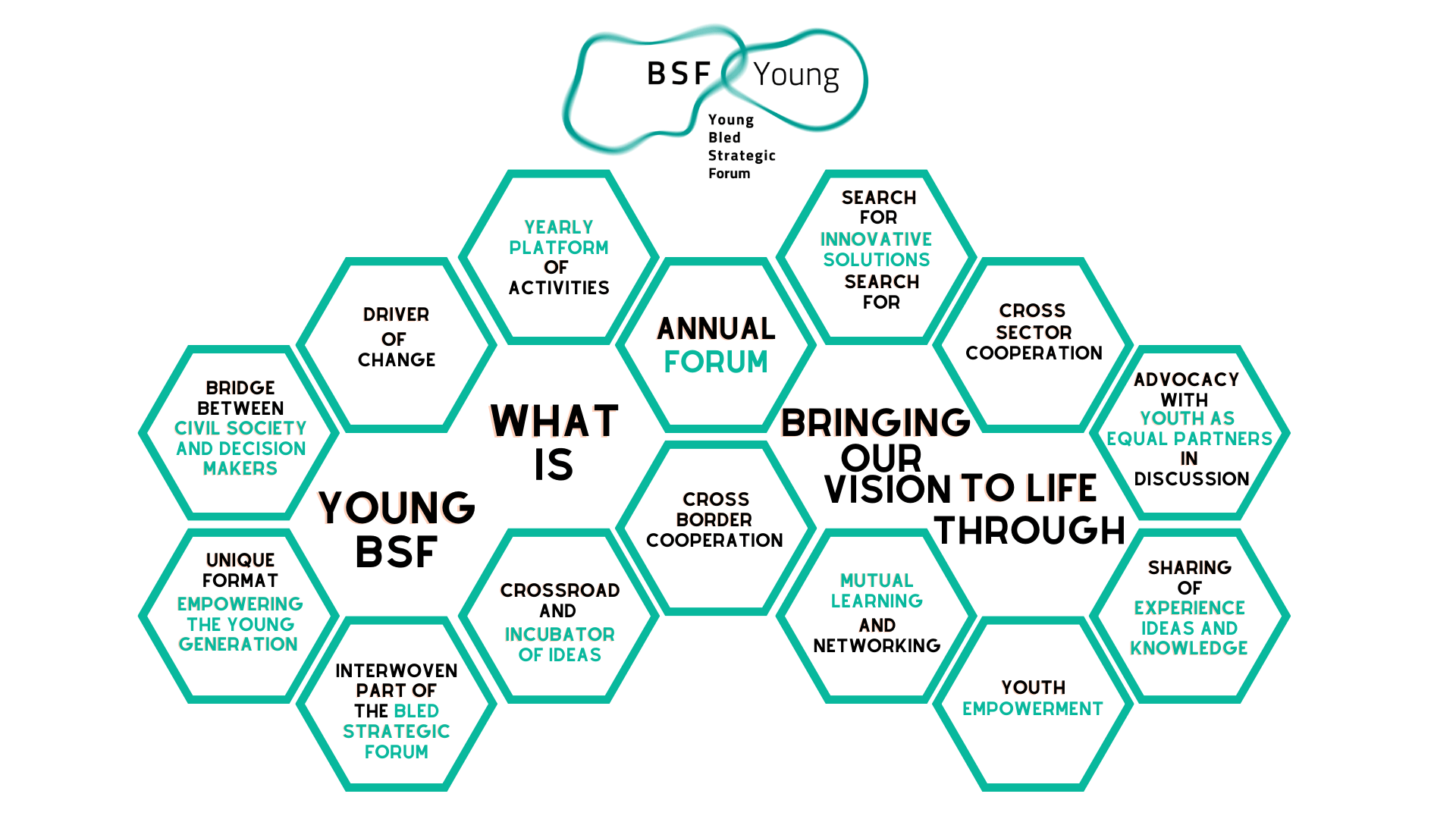 Čeprav je konferenca vsa leta obravnavala različne teme razprav, ostaja vodilna vizija Mladih BSF enaka: povezati željne, motivirane mlade posameznike in aktivne državljane z različnih strokovnih področij ter jim ponuditi kooperativno, ustvarjalno in motivirano okolje za razprave in mreženje.